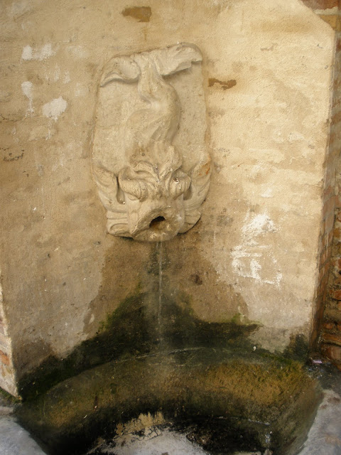 Next to the fountain is the old fish market. It's not that 'old' for Italy, but it still predates our independence, if I remember correctly. It was set up as a moderately sized open air market for Rimini's fishermen to ply their trade, with fancy marble tables running the length of the market on both sides and four dolphin fountains providing water for various fishy uses, not the least of which was cleaning out the nastiness of the catch-all troughs that ran below the tables.